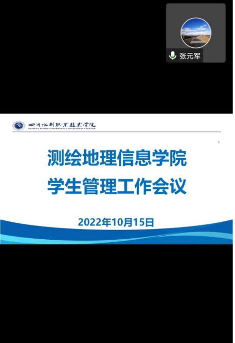 为贯彻落实疫情防控精神,有序开展学生管理工作,加强学生日常行为管理。10月15日下午,测绘地理信息学院组织全体专兼职辅导员线上召开学生管理工作会议。会议由学管干事杨利珍老师主持。