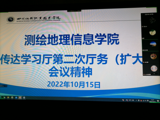 10月15日,测绘地理信息学院召开教职工大会,倡议全院上下喜迎二十大、齐心建双高、潜心育人才。