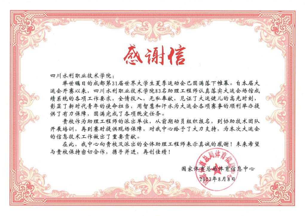 2023年的八月对全世界的青年大学生运动员来说必定是一场难忘的记忆,2023年7月28日举世瞩目的成都第31届世界大学生夏季运动会如期开幕。这个盛夏青年运动员们奋力拼搏,志愿者、裁判员们用热情专业的服务、温暖友善的态度全力保障大运会的顺利举行。和其他高校一起,四川水利职业技术学院测绘地理信息学院派出了83位志愿者们参与了此次大运会技术志愿服务,他们在自己的工作岗位上认真负责、踏实肯干获得了赛场运动员、其他高校志愿者、工作人员的一致认可。今天,学校收到了来自国家体育总局信息中心的感谢信,来信表达了对83名志愿者的高度肯定和极高评价,充分肯定了我校青年志愿者在此次成都大运会志愿服务中的成果。