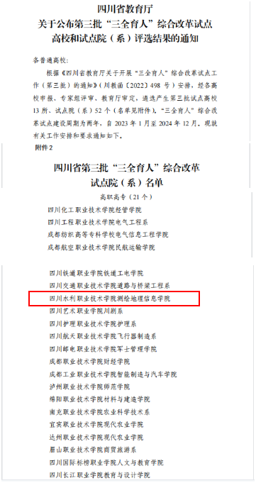 近日,四川省教育厅公布四川省第三批“三全育人”综合改革试点高校和试点院(系)评选结果,测绘地理信息学院成功入选四川省“三全育人”综合改革试点院(系)。